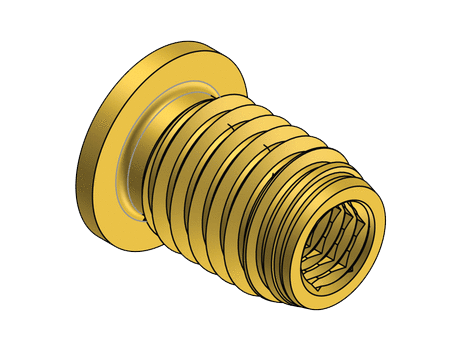 El modelo IVK está equipado con una cabeza ensanchada que se apoya sobre la superficie de la pieza, proporcionando una mejor distribución de esfuerzos y un bloqueo antideslizamiento. Es ideal para plásticos blandos y materiales de baja densidad.IVH – Inserto roscado de latón sin cabeza